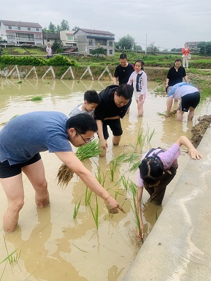随后,在农技专家指导下,社员们分工协作、密切配合,一个个带着子女卷起裤脚、走下泥田,盯住标准行间距,你提秧苗我插秧,与当地群众一起边“摆龙门阵”边插秧,在欢声笑语中圆满完成了园区内最后几块秧田的种植任务,度过了美好的一天。
