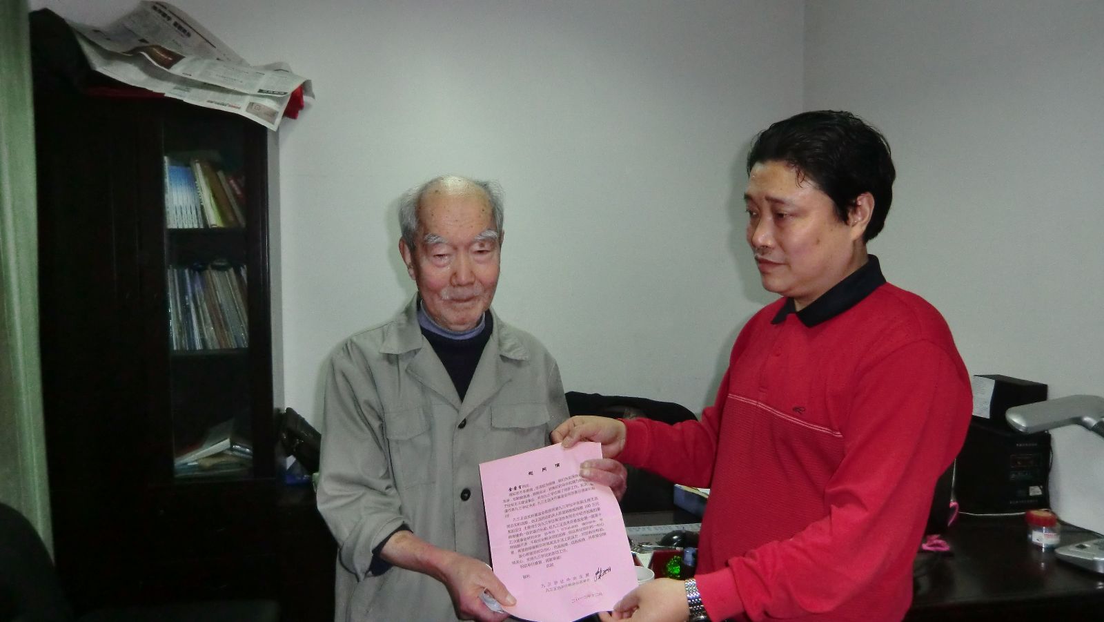 社市委秘书长肖堃向金荣言同志颁发社中央韩启德主席的慰问信